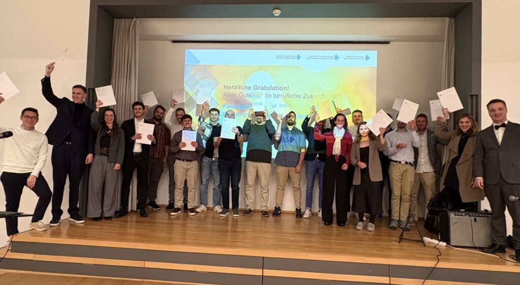 Am 29. November 2025 wurden in Bern die frisch diplomierten Geomatiktechniker*innen des BIZ-Geo gefeiert. Ein besonderer Höhepunkt war die Keynote von Roli Theiler, der einen spannenden Rückblick auf 40 Jahre Weiterbildung im Geomatik-Bereich präsentierte. Abgerundet wurde der Anlass durch eine stimmungsvolle musikalische Begleitung, die dem Abend einen festlichen Rahmen verlieh.