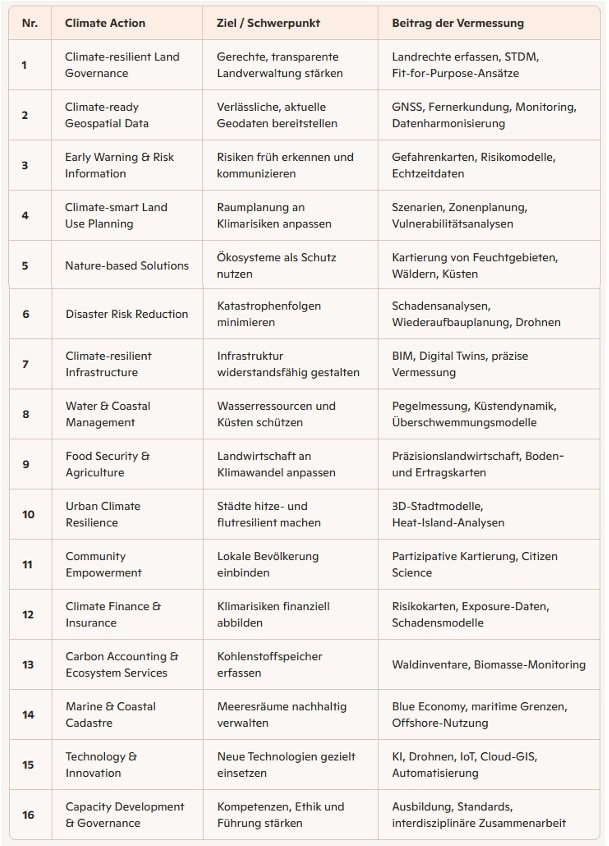 Le rôle de la topographie face au changement climatique : la topographie couvre les espaces terrestres, aquatiques et maritimes et sert de base aux analyses des risques climatiques, au suivi et à la planification durable. La publication souligne que la résilience va au-delà de la simple durabilité : les systèmes doivent non seulement être respectueux de l'environnement, mais aussi adaptables et résistants. La gouvernance foncière comme levier central : une gestion foncière équitable est essentielle pour la protection du climat et la résilience, et ne constitue pas seulement un aspect secondaire. La publication met en avant des outils tels que le STDM, le Continuum of Land Rights et la Fit-for-Purpose Land Administration, qui contribuent à garantir les droits fonciers et à stabiliser les communautés après une catastrophe. La publication structure ses recommandations en 16 actions climatiques prioritaires, qui définissent des mesures concrètes à l'intention des professionnels. Parmi celles-ci figurent notamment :